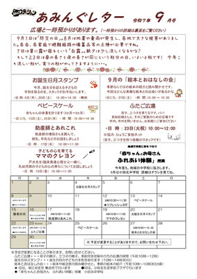 27日 8月 2025 8月も今日と明日の2日間、来週月曜日からは9月です(^^) この暑さ、まだまだ続きそうです。熱中症にもまだ気をつけて下さいね。あみんぐレター9月号です♫ tagPlaceholderカテゴリ: あみんぐレター